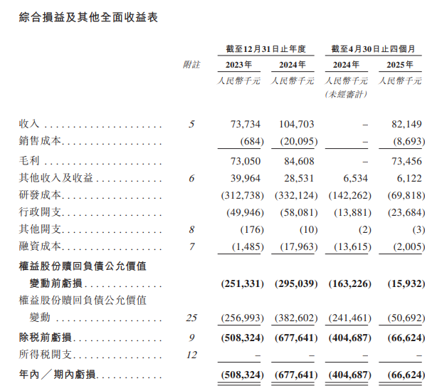 公司业绩]article_adlist-->招股书显示,在过去的2023年、2024年和2025年前四个月,劲方医药的营业收入分别为人民币0.74亿、1.05亿和0.82亿元,相应的研发开支分别为人民币3.13亿、3.32亿和0.698亿元,相应的净亏损分别为人民币5.08亿、6.78亿和 0.66亿元。