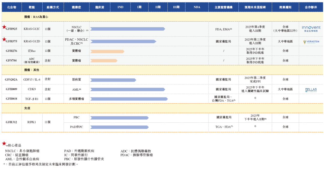 除核心产品外,劲方医药正在建立一个全面且差异化的RAS产品矩阵,包括GFH375(一款口服生物利用度好的KRAS G12D小分子抑制剂)、GFH276(一种泛RAS(活化)非降解类分子胶)、GFS784(一种利用大小分子协同效应的新型药物模式)。此外,亦致力于进一步丰富产品管线组合,例如GFS202A(针对GDF15和IL-6的双特异性抗体)、GFH009(一种选择性小分子化合物,以CDK9为靶点)、GFH018(一种强效的TGF-βR1小分子抑制剂)。